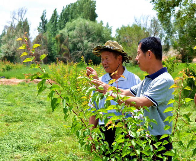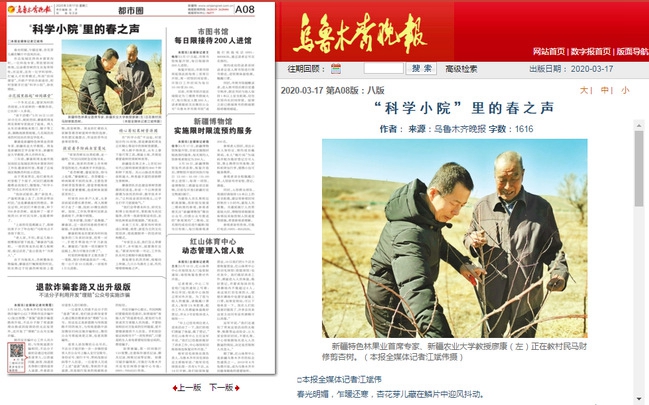 在达坂城雷家沟村,也有廖康活跃的身影。2017年,他和雷家沟村联手打造“科学小院”,筹建了达坂城区晚熟杏科技示范园。在这里他打破人才培育模式,布局“田间课堂”,开辟产学结合新途径,培育一批新型职业农民,走特色林果业的致富路,助农增收。廖康团队还在村里筹划了果树资源圃,计划形成一个以种质资源圃为依托的科研、教学技术平台,“让科技走进田间地头,让学生们学习更接地气。”廖康说,将来本科生、研究生和博士生都将驻地研究,零距离为农民服务。