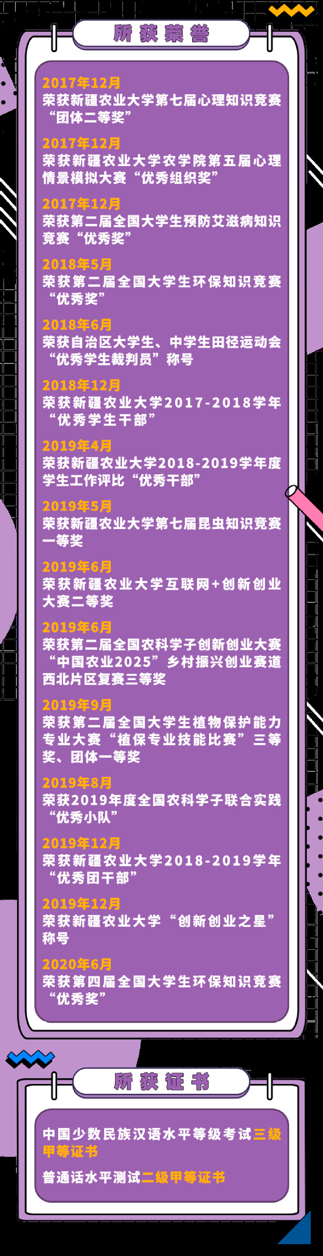 祖丽皮耶在班级担任过团支部书记、班长和心理委员等职务,同时又是校、院学生会干部的她,学生工作繁忙,但梳理的井井有条,为班级和学院赢得了很多荣誉。作为新时代青年,她认为学习是学生的本职工作,但是也要德智体美劳全面发展。“我不想让我的青春都在遗憾中度过,我要行走在青春的路上!”祖丽皮耶说。