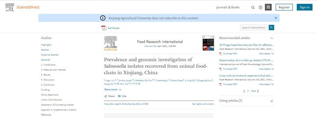 2021年4月在Food Research International(IF 6.475, 1区)期刊杂志上发表了论文“Prevalsence and Genomic Investigation of Salmonella Isolates Recovered from Animal Food-chain in Xinjiang, China”。这是我们首次报道了在新疆地区动物源性食品产业链中污染流行的多重耐药沙门菌,及其携带编码的关键毒力因子情况,通过采用全基因组测序平台对沙门菌进行溯源研究有助于对食品产业链上出现的多重耐药菌的鉴定和早期控制。
