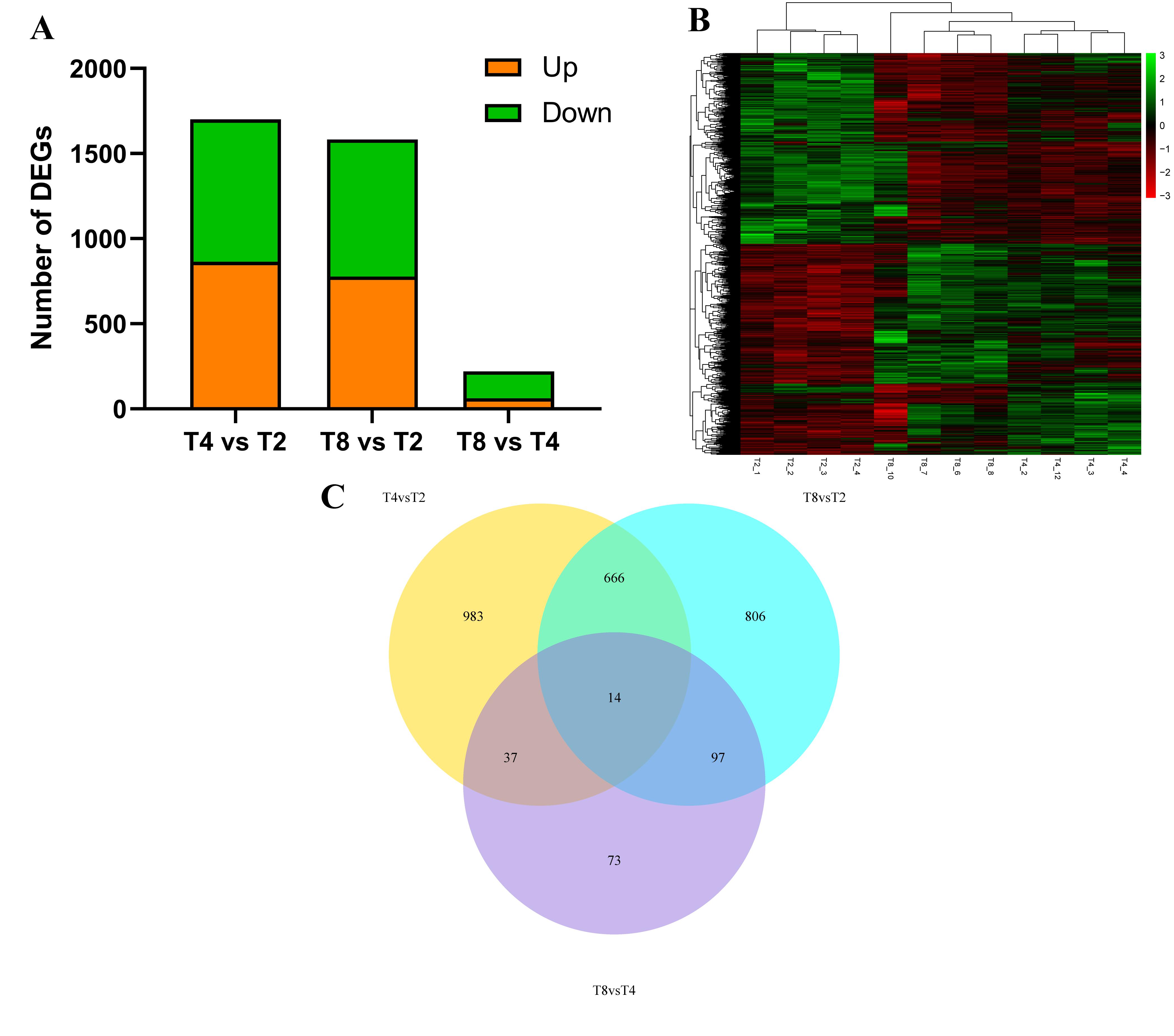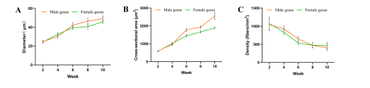 研究团队对2、4、6、810周龄伊犁鹅的腿部肌肉组织学特性及腿肌mRNA表达谱进行比较分析,筛选与伊犁鹅肌肉发育相关的差异表达基因,通过生物信息学预测差异基因潜在的生物学功能。研究发现伊犁鹅腿肌肌纤维直径和密度随周龄的增加而增加,公鹅在4-6周龄时肌纤维直径和横截面积增长最快,肌纤维密度在4-8周龄迅速下降,母鹅在2-6周龄时肌纤维直径和横截面积增长最快,密度迅速减小,6周龄之后肌纤维增长速度逐渐下降。同时,研究筛选出4个(ITGB3、ITGB6、ACTBLAMA4)与鹅肌纤维的早期生长发育相关的重要调控基因以及TGF-β signaling pathwayMAPK signaling pathway等调控通路,为进一步研究鹅肌肉生长发育分子机制提供了基础。