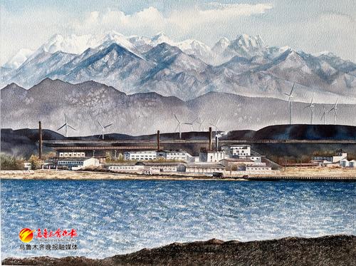 讲述起乌鲁木齐生活的哈米德·热扎颇有些滔滔不绝。欣赏画家王钰水彩作品《有风的地方》时,看到远处的雪山连绵起伏,中景为散落在戈壁中的大风车,既有梦幻的色彩,耳边似乎还传来呼呼的风声;一列急驰的火车正沿着高高低低的建筑群奔向远方,近景则是闪着粼粼波光的盐湖。哈米德·热扎和阿拉木·朱乃德都沉醉其中,听说盐湖距离乌鲁木齐不远,他们马上表示改天要相约同学一起去看看。