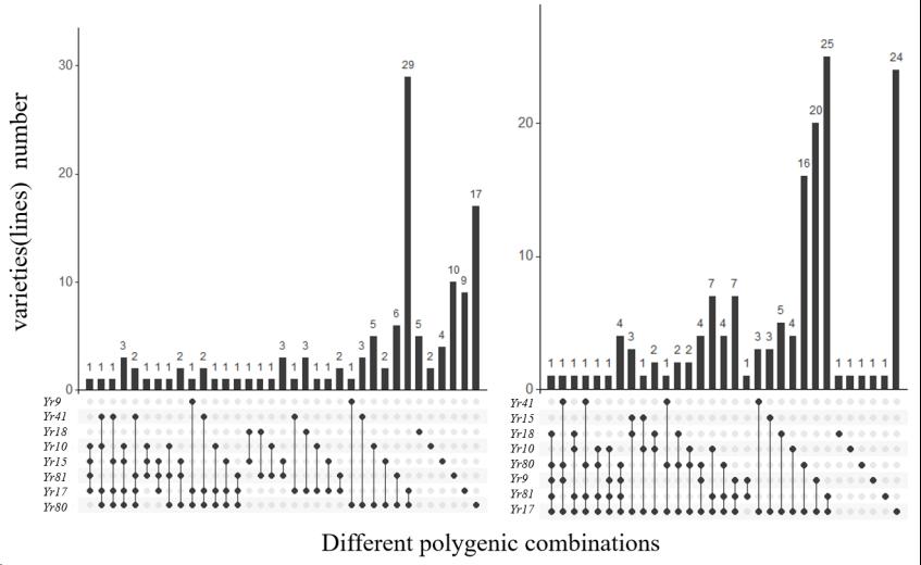 利用与Yr5、Yr9、Yr10等抗条锈病基因相连的分子标记对新疆小麦品种进行抗条锈病基因检测,结合苗期鉴定结果综合分析发现,Yr17+Yr80Yr17+Yr81的抗性基因组合在春小麦和冬小麦中的占比最多,Yr17Yr9的协同作用可以有效提高小麦对条锈菌的抗性,Yr5Yr15等对条锈病具有较强抗性的基因在新疆小麦中占比较少。本研究为新疆小麦抗条锈病育种提供给重要的参考价值。