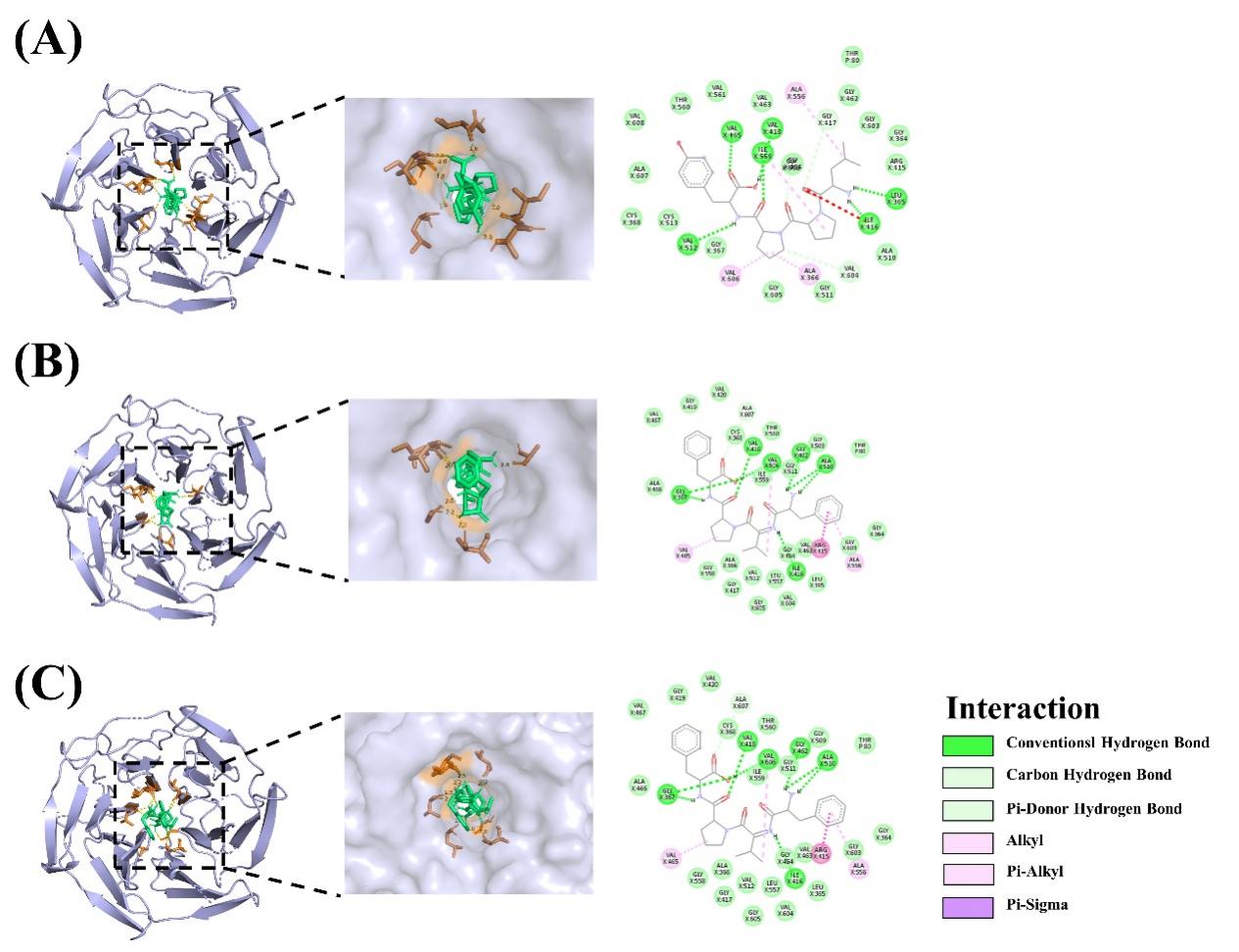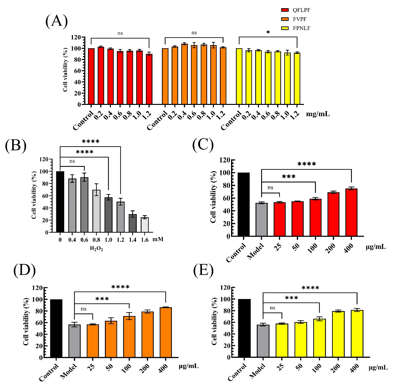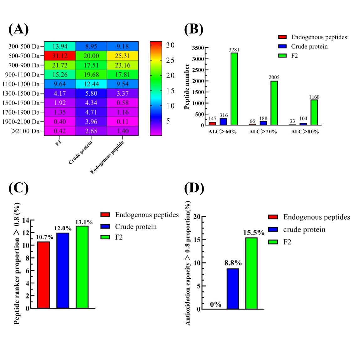 研究人员首先基于单因素以及响应面法,以抗氧化能力作为响应指标,对多花黄精粗蛋白酶解方法进行优化,然后基于抗氧化活性追踪的原则,通过体外抗氧化实验结合超滤膜分离以及Sephadex G-25凝胶柱层析分离得到了抗氧化能力最强的多花黄精粗蛋白水解物组分PcPH-I-F2。随后使用Nano-LC-Q Exactive Plus quadrupole-orbitrap mass spectrometry对粗蛋白、内源性肽以及PcPH-I-F2序列进行鉴定,得出F2组分中存在的肽的数量(11704)显著高于内源性肽(2454)和粗蛋白(2334),证明了抗氧化肽的有效富集、并通过生物信息学以及分子对接预测得出抗氧化潜力最高的三个序列分别为QFLPF、FVPF以及FPNLF。最后使用过氧化氢对HepG2细胞进行氧化损伤模型建立,使用三种肽进行干预,验证了其在浓度为100μg/mL时与模型组相比细胞存活率提高6.39%QFLPF)、14.51%FVPF)和9.98%FPNLF)。