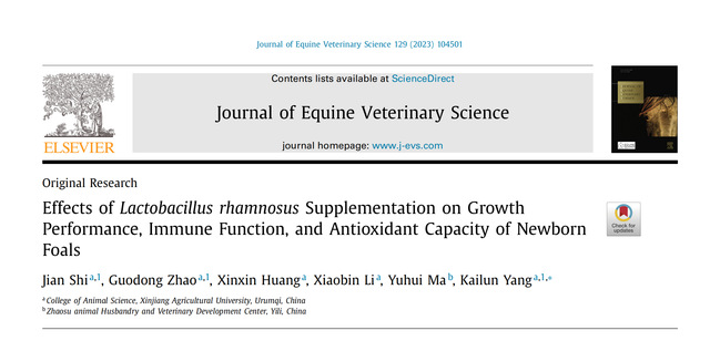Abstract: This study aimed to explore the effects of Lactobacillus rhamnosu GG (LGG) supplementation on the growth performance, immune function, and antioxidant capacity of foals. Fifteen newborn foals with similar birth weight (51.67 + 6.07 kg) and good health were randomly assigned to three groups: controgroup and test groups I and Ⅱ, which were supplemented with 5.0 × 109 CFU/day and 1.0 × 1010 CFU/day LGG, respectively, for 150 days. LGG intake increased the daily body height (p< .01) and weight (p < .01) gain of foals aged 120 to 150 days, The foals' IgA (P< .05) and lgG (P< .01) plasma levels increased at 30 and 150 days, respectively, and IL-6 plasma level increased at 90 days (P< .01). Plasma total antioxidantcapacity level was significantly higher in test group I than in the control and test group Ⅱ at 30 days (p<.01), whereas glutathione peroxidase level was signifcantly higher in test group Ⅱ than in the controand test group I at 30 days (P< .01). Both test groups had signifcantly higher superoxide dismutaselevel than the control group (P< .01)and signifcantly decreased malondialdehyde plasma level at 90 and 150 days (P < .05). Overall, our findings indicate that dietary supplementation of LGG can improve the growth performance, immune function, and antioxidant capacity of newborn foals.