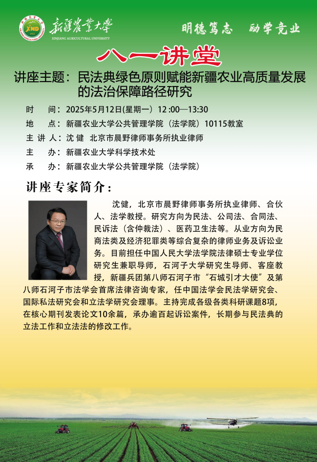 【八一讲堂预告】九十期:民法典绿色原则赋能新疆农业高质量发展的法治保障路径研究